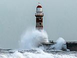 The Met Office has issued an amber weather warning – meaning lives are in danger – for northeast Scotland and England as well as yellow weather warnings for Friday and Saturday. Forecasters warn snow is possible, ‘almost anywhere away from the far-south’. Pictured, waves at Roker Lighthouse in Sunderland today