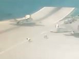 The clip shows the jet appear to struggle to accelerate as it approaches the take-off ramp. Crew on the flight deck then watch in horror as it plunges over the edge.