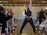 Footage captured at East Horton Golf Centre in Hampshire shows Matthew Bell, who was also one of two best men, wiggle his hips and interact with the wedding guests as he makes his entrance.