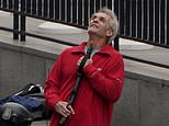 The man with grey hair wearing a red sweater is seen pacing outside the UN building holding a shotgun to his head