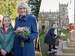 Duchess of Cornwall is elegant in blue as she’s greeted by schoolchildren before laying flowers to mark the 100th anniversary of Seend War Memorial during visit to Wiltshire