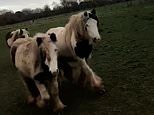 Dogwalker Pete evaded a herd of hungry horses he had just fed in Clwyd, WalesThe man can be heard nervously laughing as he walks and calls for his two dogs Pete and the dogs, Sherlock and Tiny, ran from the horses, who wanted carrots