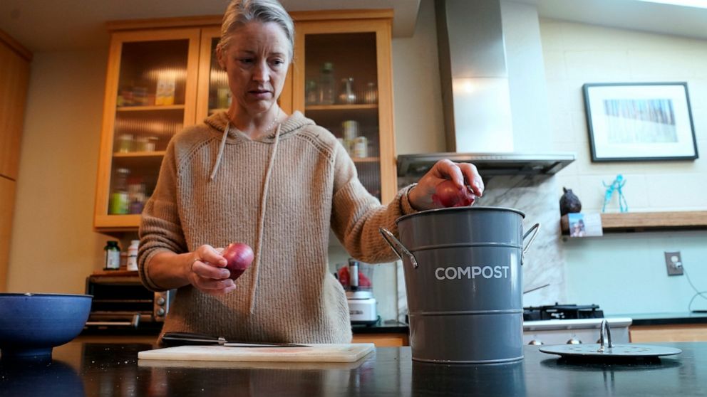 Davis is among California cities that already have a mandatory food recycling program. Joy Klineberg, a mother of three, puts coffee grounds, fruit rinds and cooking scraps into a metal bin labeled “compost” on her countertop. When preparing dinners, she empties excess food from the cutting board into the bin.