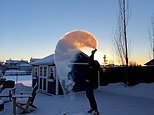 The resident throws the boiling water over his head in a circular motion before watching it turn to ice in Alberta, Canada, on December 27