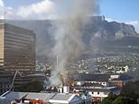A column of black smoke rises into the air as the blaze rips through the Houses of Parliament in South Africa