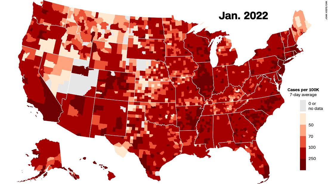 Another dramatic rise overwhelms the map starting in December, likely attributable to the more transmissible Omicron variant. As of this week, nearly every county is reporting average rates higher than 100 new cases per 100,000 people. Average daily new cases nationwide are now more than three times the pandemic’s peak last winter.