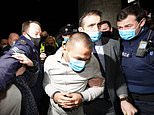 He was pictured wearing a mask and a grey tracksuit as he arrived, surrounded by police officers, press photographers and angry onlookers.