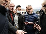 Novak Djokovic, center, with mask arrives in the municipal building in Budva, Montenegro, Friday, Jan. 28, 2022. Djokovic arrived to receive a plaque declaring him an honorary citizen of the town
