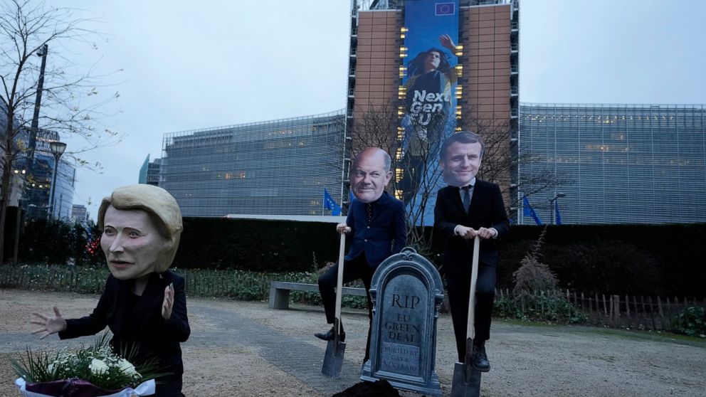Protesters from the Avaaz network wore masks of European Commission President Ursula von der Leyen, French President Emmanuel Macron and German Chancellor Olaf Scholz as they posed in front of a tombstone reading, “RIP EU Green Deal. Killed by Gas and Nuclear.”