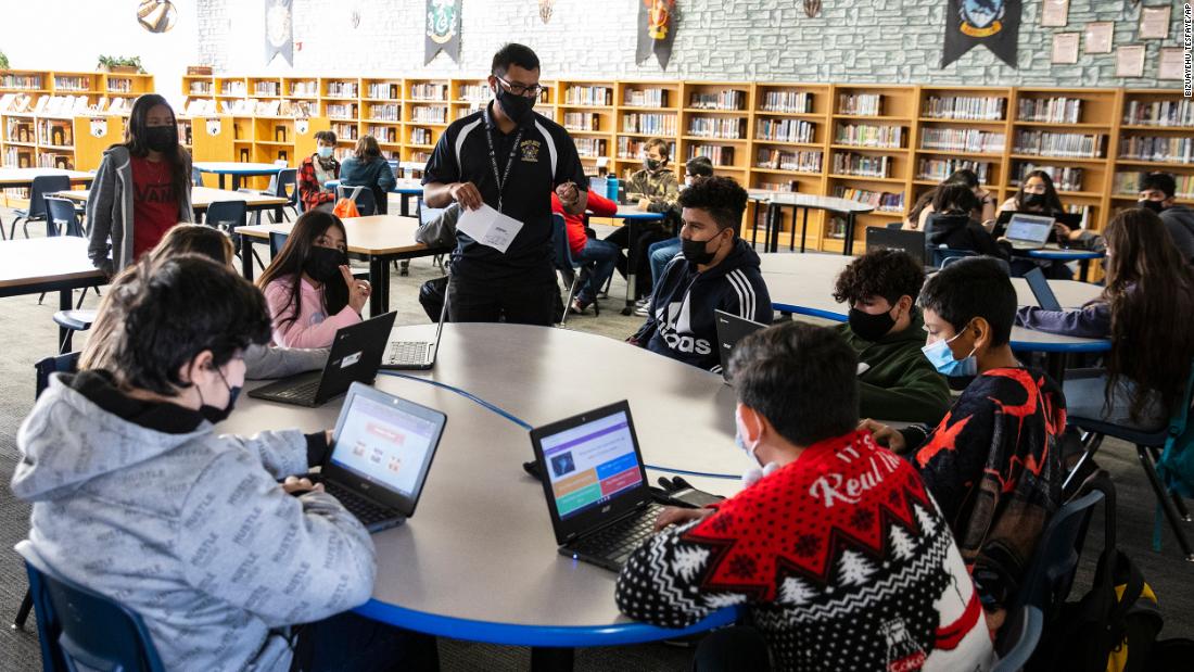 A substitute teacher at a Las Vegas middle school works with three classes of students at the school library in December 2021.