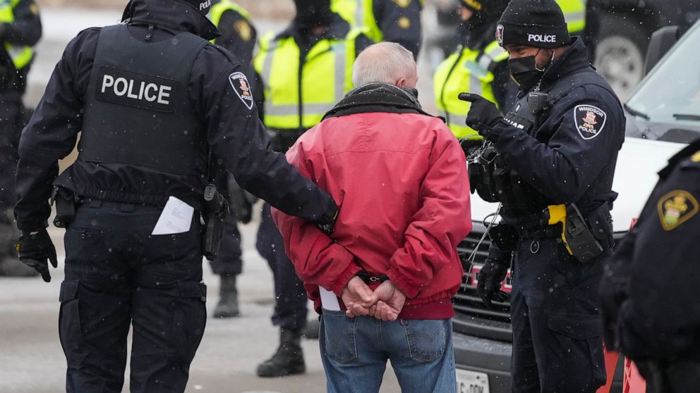 WINDSOR, Ontario — Police moved in to clear and arrest the remaining protesters near the busiest U.S.-Canadian border crossing Sunday, ending a demonstration against COVID-19 restrictions that has hurt the economy of both nations even as they held back from a crackdown on a larger protest in the capital, Ottawa.