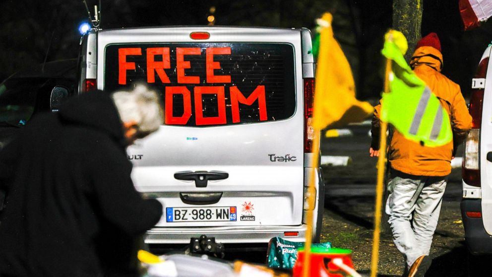 In the Netherlands, dozens of trucks and other vehicles — ranging from tractors to a car towing a camping van — arrived in The Hague for a similar virus-related protest Saturday, blocking an entrance to the historic Dutch parliamentary complex.