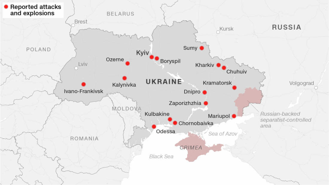 Several areas across Ukraine came under attack on Thursday morning after Russian President Vladimir Putin declared the start of a “special military operation” and warned of bloodshed unless Ukrainian forces lay down their arms.