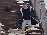 In the video, the monkeys can be seen sitting on the snow-covered steps leading up to the temple.