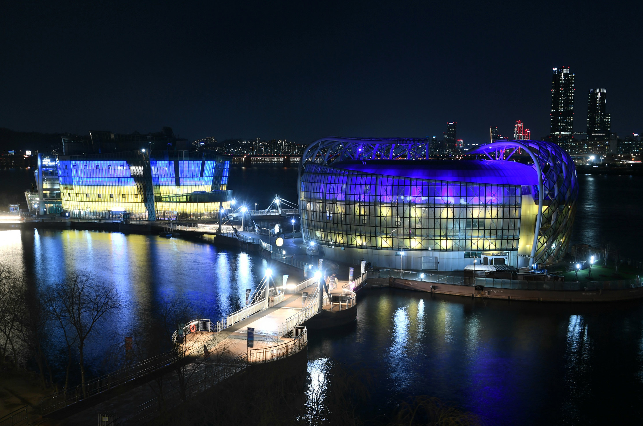 The Sebitseom islets in Seoul are lit up in the colors of the Ukrainian flag on Feb. 28. (Seoul Metropolitan Government)