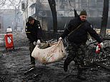 Kyiv is preparing to come under fresh bombardment today after Moscow warned civilians to flee or else face being killed (pictured, bodies of people killed in last night’s strike are covered by police)