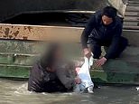 This is the moment workers on a barge rescued a mother and baby from their car when it veered into a lake in China.