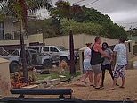 As more concerned neighbours emerge from their homes the driver is seen throwing a bag over her shoulder and attempts to walk away from the ute.