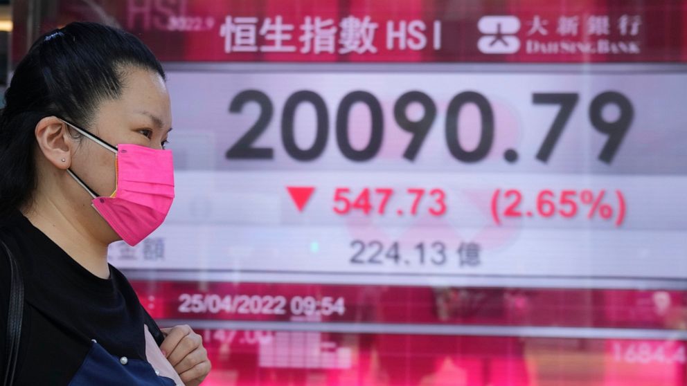 In Asian trading, Japan’s benchmark Nikkei 225 lost 1.9% to finish at 26,590.78. South Korea’s Kospi slipped 1.8% to 2,657.13. Hong Kong’s Hang Seng dropped 770 points to 19,869.34, while the Shanghai Composite shed 158 points to 2,928.51, dipping below 3,000 for the first time since July 2020.