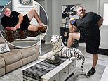 In one, he lays on a leopard-print rug, while another shows him with one foot up on a coffee table and his right arm flexed to show off his bicep.