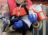 One young British soldier was seen carefully cradling a baby in his arms as a family disembarked from a lifeboat. He carried the baby slowly up the walkway while her parents helped her older sister, who was seen crying after she fell over on the gangway.