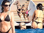 But ahead of donning her flowing white dress for the big day, Kourtney Kardashian slipped into a tiny black bikini on Friday as she enjoyed some downtime on board a luxury $14.2million yacht with her family.
