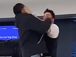 The employee is left bloodied on a luggage conveyor belt after the vicious brawl at Newark Airport