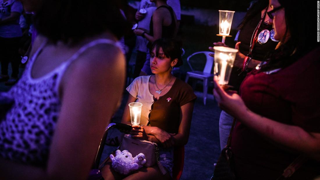 A young woman holds a candle during a candlelight vigil to honor and remember the victims of the mass shooting in Uvalde, Texas on May 30, 2022.