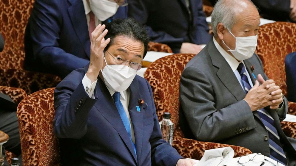 Japanese Prime Minister Fumio Kishida raises hand to speak at Budget Committee of the upper house of the Diet, Tuesday May 31, 2022 in Tokyo. Japan’s parliament on Tuesday enacted a 2.7 trillion yen ($21 billion) extra budget to tackle soaring fuel and food prices following Russian invasion of Ukraine. (Kyodo News via AP)