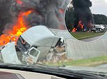 Photos from the scene show shredded semis piled on top of each other and scattered across the highway, while a ball of fire consumes them and spreads across the median.